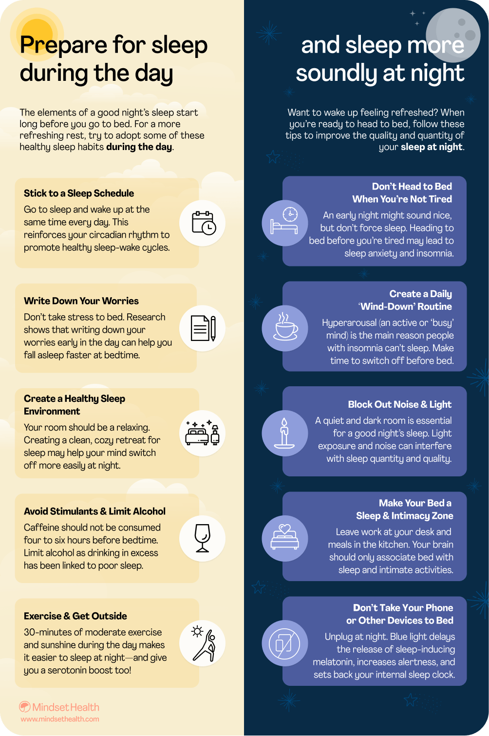 Consistent and healthy behaviors that support restful and quality sleep. These habits help regulate the body’s internal clock and promote physical and mental well-being. Practicing good sleep habits can improve overall sleep patterns and daytime functioning.